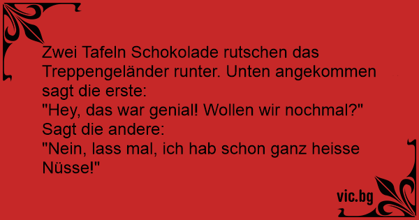 Zwei Tafeln Schokolade rutschen das Treppengeländer runter. Unten angekommen sagt die erste: