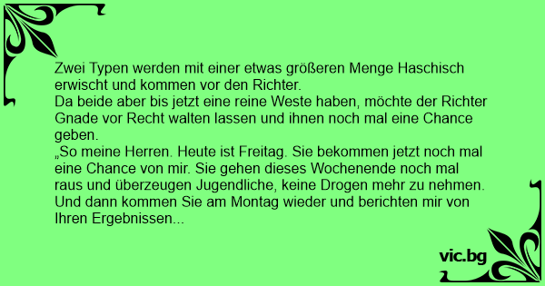 „So meine Herren. Heute ist Freitag. Sie bekommen jetzt noch mal eine Chance von mir. Sie gehen dieses Wochenende noch mal raus und überzeugen Jugendliche, keine Drogen mehr zu nehmen. Und dann kommen Sie am Montag wieder und berichten mir von Ihren Ergebnissen und dann sehen wir