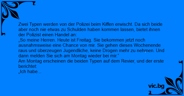 „So meine Herren. Heute ist Freitag. Sie bekommen jetzt noch ausnahmsweise eine Chance von mir. Sie gehen dieses Wochenende raus und überzeugen Jugendliche, keine Drogen mehr zu nehmen. Und dann melden Sie sich am Montag wieder bei mir.“