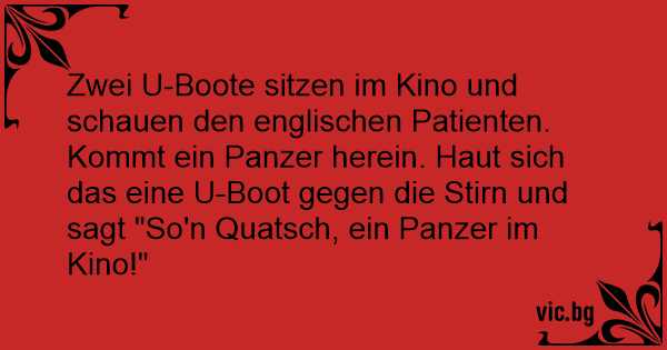 Zwei U-Boote sitzen im Kino und schauen den englischen Patienten. Kommt ein Panzer herein. Haut sich das eine U-Boot gegen die Stirn und sagt "So'n Quатsсh, ein Panzer im Kino!"