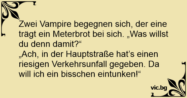 Zwei Vampire begegnen sich, der eine trägt ein Meterbrot bei sich. „Was willst du denn damit?“