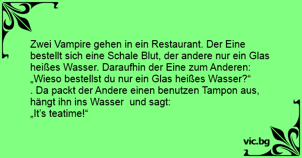 Ein Vampir geht in eine Bar und bestellt sich ein heißes Glas Wasser.Da fragt der Wirt neugierig: "Hmm, warum wollen sie heißes Wasser und kein Blut?" Da holt der Vampir einen blutigen Tampon...