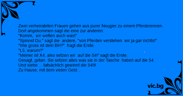 Zu Hause, mit dem vielen Geld angekomnmen, erzählen die Beiden die Geschichte ihren Ehemännern. Diese sind sehr erstaunt über die Logik ihrer Frauen und gehen am nächsten Sonntag ebenfalls zum Pferderennen. Dort angekommen sagt der eine zum anderen: