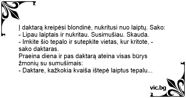Į daktarą kreipėsi blondinė, nukritusi nuo laiptų. Sako:
