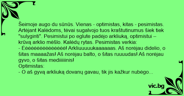 Šeimoje augo du sūnūs. Vienas - optimistas, kitas - pesimistas. Artėjant Kalėdoms, tėvai sugalvojo tuos kraštutinumus šiek tiek "sulyginti". Pesimistui po eglute padėjo arkliuką, optimistui – krūvą arklio mėšlo. Kalėdų rytas. Pesimistas verkia:
