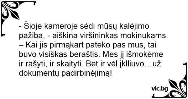 - Šioje kameroje sėdi mūsų kalėjimo pažiba, - aiškina viršininkas mokinukams. – Kai jis pirmąkart pateko pas mus, tai buvo visiškas beraštis. Mes jį išmokėme ir rašyti, ir skaityti. Bet ir vėl įklliuvo…už dokumentų padirbinėjimą!
