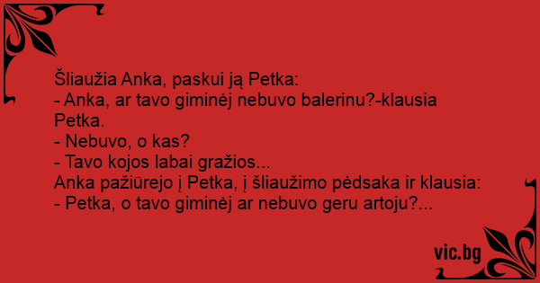 - Anka, ar tavo giminėj nebuvo balerinu?-klausia Petka.
