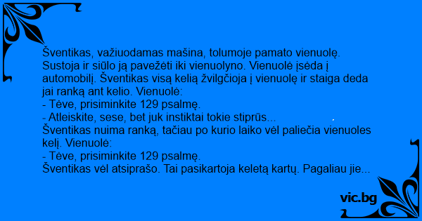 Mladá jeptiška stopuje a zastaví ji docela pohlednej mladík. Po chvilce jízdy jí položí ruku na koleno a jeptiška povídá: „Žalm 12, verš 5.” Mladík se lekne, stáhne ruku zpátky a celou cestu už dá...