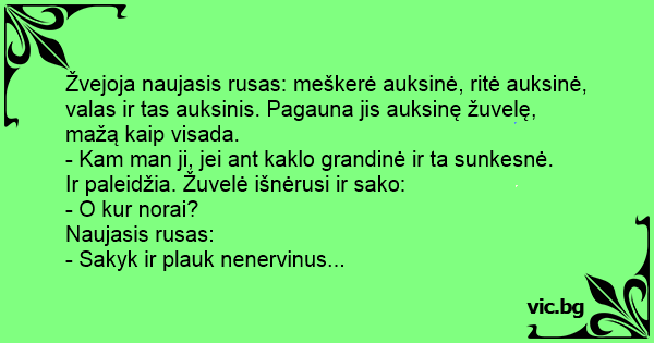 Žvejoja naujasis rusas: meškerė auksinė, ritė auksinė, valas ir tas auksinis. Pagauna jis auksinę žuvelę, mažą kaip visada.