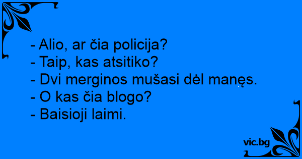 - Alio, policija? - Taip, kas nutiko? - Dvi merginos mušasi dėl manęs. - Tai ką? - Baisesnė laimi. - Tuoj atvažiuojam.