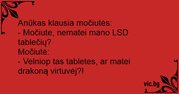 Dēls jautā: Vecmāmiņ vai neesi redzējusi tabletes ar uzrakstu LSD? Vecmāmiņa : da piekāst tās tabletes, vai tu redzēji to pūķi virtuvē?!