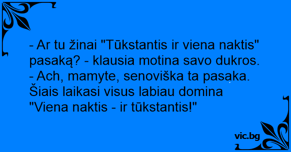 - Ach, mamyte, senoviška ta pasaka. Šiais laikasi visus labiau domina "Viena naktis - ir tūkstantis!"