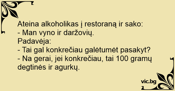 - Na gerai, jei konkrečiau, tai 100 gramų degtinės ir agurkų.