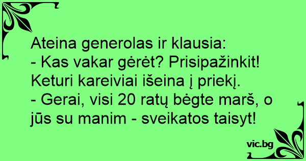 - Gerai, visi 20 ratų bėgte marš, o jūs su manim - sveikatos taisyt!