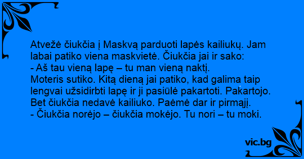 Atvežė čiukčia į Maskvą parduoti lapės kailiukų. Jam labai patiko viena maskvietė. Čiukčia jai ir sako: