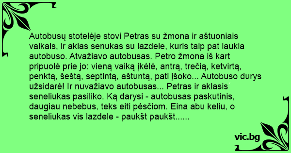 Autobusų stotelėje stovi Petras su žmona ir aštuoniais vaikais, ir aklas senukas su lazdele, kuris taip pat laukia autobuso. Atvažiavo autobusas. Petro žmona iš kart pripuolė prie jo: vieną vaiką įkėlė, antrą, trečią, ketvirtą, penktą, šeštą, septintą, aštuntą, pati įšoko... Autobuso durys užsidarė! Ir nuvažiavo autobusas... Petras ir aklasis seneliukas pasiliko. Ką darysi - autobusas paskutinis, daugiau nebebus, teks eiti pėsčiom. Eina abu keliu, o seneliukas vis lazdele - paukšt paukšt... paukšt paukšt... kelio ieško, tikrina kur eit. Ir taip visą laiką: paukšt paukšt... paukšt paukšt... Petras galų gale neiškentė, atsisuko ir sako: