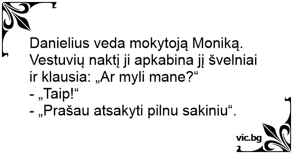 Danielius veda mokytoją Moniką. Vestuvių naktį ji apkabina jį švelniai ir klausia: „Ar myli mane?“