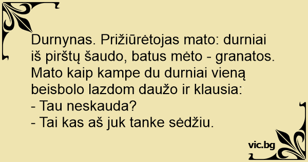Durnynas. Prižiūrėtojas mato: durniai iš pirštų šaudo, batus mėto - granatos. Mato kaip kampe du durniai vieną beisbolo lazdom daužo ir klausia: