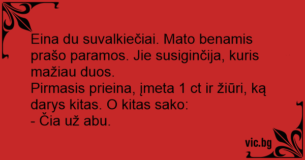 Eina du suvalkiečiai. Mato benamis prašo paramos. Jie susiginčija, kuris mažiau duos.