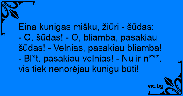 - O, šūdas! - O, bliamba, pasakiau šūdas! - Velnias, pasakiau bliamba! - Bl*t, pasakiau velnias! - Nu ir n***, vis tiek nenorėjau kunigu būti!