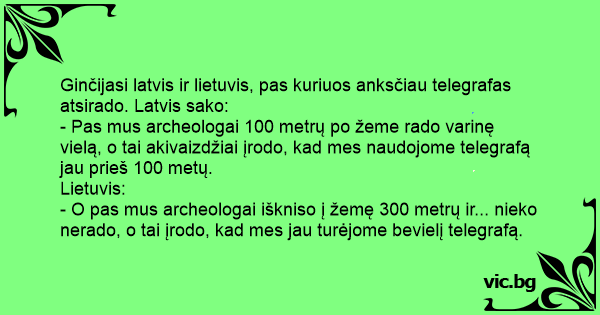 Ginčijasi latvis ir lietuvis, pas kuriuos anksčiau telegrafas atsirado. Latvis sako: