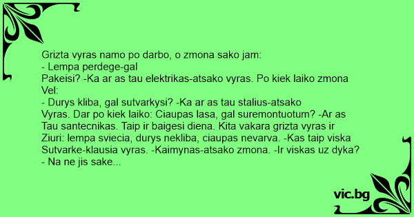 Grizta vyras namo po darbo, o zmona sako jam: