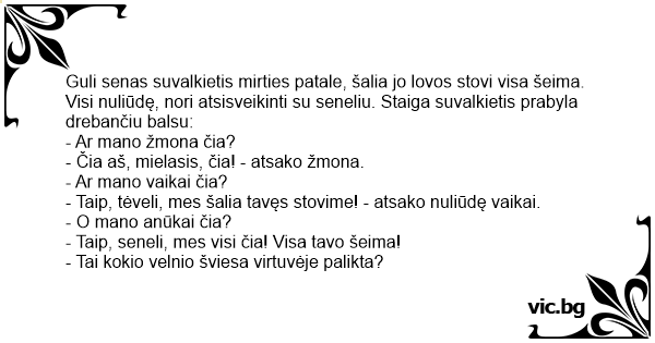Guli senas suvalkietis mirties patale, šalia jo lovos stovi visa šeima. Visi nuliūdę, nori atsisveikinti su seneliu. Staiga suvalkietis prabyla drebančiu balsu: