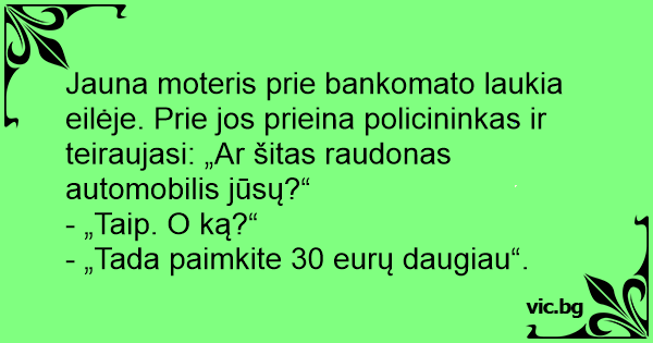 Jauna moteris prie bankomato laukia eilėje. Prie jos prieina policininkas ir teiraujasi: „Ar šitas raudonas automobilis jūsų?“