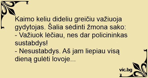 Kaimo keliu dideliu greičiu važiuoja gydytojas. Šalia sėdinti žmona sako: