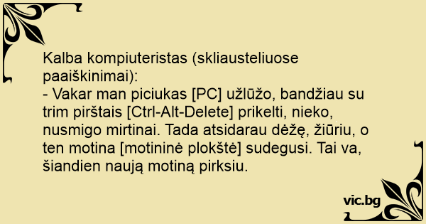 - Vakar man piciukas [PC] užlūžo, bandžiau su trim pirštais [Ctrl-Alt-Delete] prikelti, nieko, nusmigo mirtinai. Tada atsidarau dėžę, žiūriu, o ten motina [motininė plokštė] sudegusi. Tai va, šiandien naują motiną pirksiu.