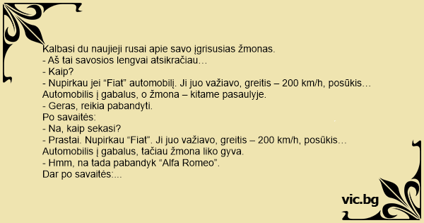 Susitinka du naujieji rusai. Pradėjo šnekėtis apie šeimyninį gyvenimą ir apie nusibodusias žmonas. Vienas sako: - O aš savosios atsikračiau. - Kaip!? - Na kaip, nupirkau aš jai "Alfa-Romeo". Ji...