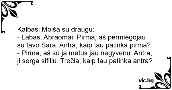 - Labas, Abraomai. Pirma, aš permiegojau su tavo Sara. Antra, kaip tau patinka pirma?