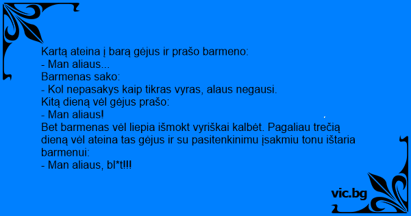 Bet barmenas vėl liepia išmokt vyriškai kalbėt. Pagaliau trečią dieną vėl ateina tas gėjus ir su pasitenkinimu įsakmiu tonu ištaria barmenui: