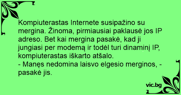 Kompiuterastas Internete susipažino su mergina. Žinoma, pirmiausiai paklausė jos IP adreso. Bet kai mergina pasakė, kad ji jungiasi per modemą ir todėl turi dinaminį IP, kompiuterastas iškarto atšalo.