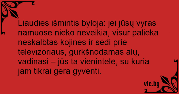 Liaudies išmintis byloja: jei jūsų vyras namuose nieko neveikia, visur palieka neskalbtas kojines ir sėdi prie televizoriaus, gurkšnodamas alų, vadinasi – jūs ta vienintelė, su kuria jam tikrai gera gyventi.