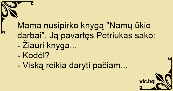 Mama nusipirko knygą "Namų ūkio darbai". Ją pavartęs Petriukas sako: