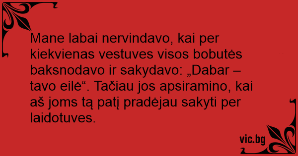 Mane labai nervindavo, kai per kiekvienas vestuves visos bobutės baksnodavo ir sakydavo: „Dabar – tavo eilė“. Tačiau jos apsiramino, kai aš joms tą patį pradėjau sakyti per laidotuves.