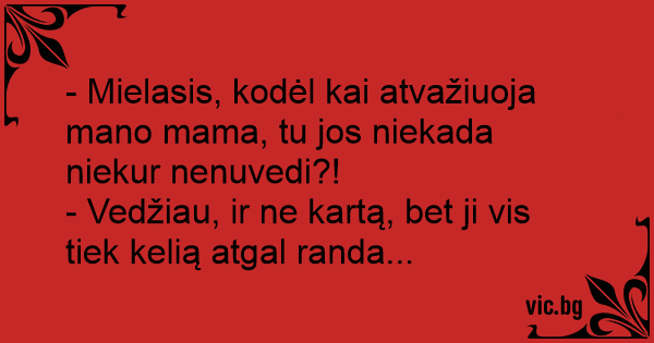 - Mielasis, kodėl kai atvažiuoja mano mama, tu jos niekada niekur nenuvedi?!