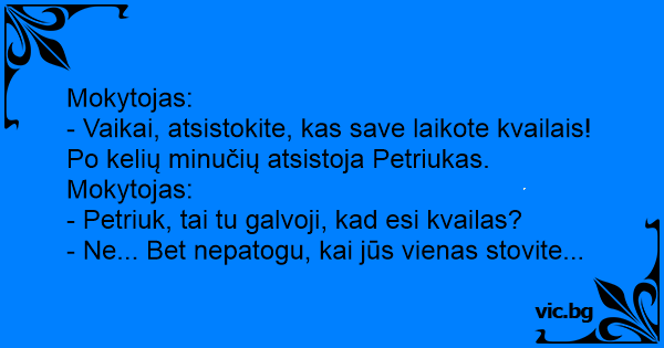 Skolotāja ienāk klasē: Kurš ir stulbs pieceļās! Jānītis pieceļās. Tu esi stulbs? Nē skolotāj, man vienkārši žēl, ka jūs viena pati stāvat!