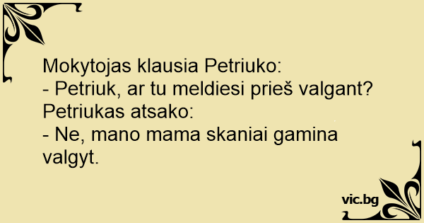 Mācītājs jautā puikam: - Vai tu pirms ēšanas Dievu lūdzi? - Nē, mamma gatavo labi.