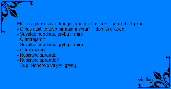 Печурки Working on the Fourth Husband Μανιτάρια Ε, δεν ήθελε να φάει τα μανιτάρια!!! Χήρος για τρίτη φορά - Ваши первые четыре мужа отравились грибами, пятый упал с лестницы. Как вы это объясните? - Τί έγινε ρε Μπάμπη, πώς πέθανε η πεθερά σου; - От какво умря първата ти жена? Разговор между двама мъже: Двама приятели си приказват: - Hur dog din första man! - Han åt giftig svamp. - Hur dog din andra man? - Han åt giftig svamp. - Hur dog din tredje man? - Honom slog jag ihjäl - Varför det? - Han vägrade äta min... Sag mal, wie geht es eigentlich dem Meier?" "Hat gerade seine dritte Frau beerdigt!" "Woran starb denn seine erste?" "Pilzvergiftung!" "Mein Gott, und die zweite?" "Pilzvergiftung!" "Mein Gott. Und... I domstolen: - Hur dog er första fru? - Hon åt giftig svamp. - Och er andra fru? - Hon åt också giftig svamp. - Den tredje då? - Hon blev ihjälslagen. - Hur gick det till? - Hon vägrade äta... No boteco, o bêbado desabafava com um amigo: — Tive três mulheres... As três morreram... — Sério? — pergunta o amigo, assustado — Mas como isso pôde acontecer? — A primeira comeu cogumelo... Kobieta mówi znajomej, że wychodzi po raz czwarty za mąż. - Jak wspaniale! Mam nadzieję, że nie będziesz miała mi za złe, jeśli spytam, co się stało z twoim pierwszym mężem? - Zjadł trujące grzyby... Un agente assicurativo viene invitato ad un matrimonio. Viene a sapere dagli altri invitati che quello è il quarto marito della sposa; così, incuriosito, non appena ha l’occasione di avvicinarsi a... Oficer NKWD przeprowadza inspekcję w podległej jednostce. W podziemiu koszar widzi trzy trupy. Pyta więc po kolei: - Ten, co? - Zmarł, bo zjadł trujące grzyby. - A ten? - Także zjadł trujące... Deux amis discutent ensemble, ils ne se sont plus vu depuis un bout de temps: - J'ai entendu que tu t'es remarié. - Oui, c'est ma quatrième fois. - Et les précédentes ? - Toutes mortes, toutes. -... Am ramas vaduva de 3 ori… povesteste o tanara de 35 de ani. - Cum se poate? Nu pot sa cred, se mira cineva. Toti trei? - Da, primii doi s-au otravit cu ciuperci. - Si al treilea? - A murit din... Twee vrienden die elkaar jaren niet gezien hadden komen elkaar tegen. En natuurlijk is de eerste vraag "Hoe gaat het met je". "Nou, niet zo goed eigenlijk", zegt de een, "Ik ben nu al voor de derde... Jim: „Slyšel jsem, že jsi se zase oženil?” Joe: „Ano. Počtvrté.” Jim: „A co se stalo s tvými předchozími manželkami?” Joe: „Všechny zemřeli.” Jim: „Jak se jim to stalo?” Joe: „Ta první se otrávila... Un signore si sta per sposare per la quarta volta e allora la fidanzata gli dice: - "Ma per che cosa è morta la tua prima moglie?" - "E poverina, ha mangiato i funghi avvelenati!" - "E la seconda?"... Olen ollut naimisissa kaksi kertaa, mies kertoi toiselle baaritiskillä. Ensimmäinen vaimoni kuoli syötyään myrkyllisiä sieniä ja toiselta vaimolta murtui pääkallo. Kauheaa, toinen mies päivitteli....