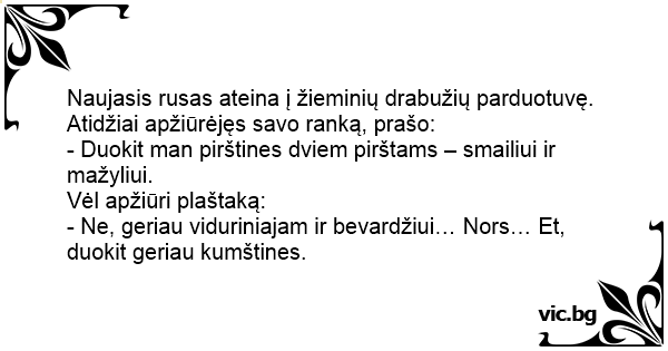 Naujasis rusas ateina į žieminių drabužių parduotuvę. Atidžiai apžiūrėjęs savo ranką, prašo:
