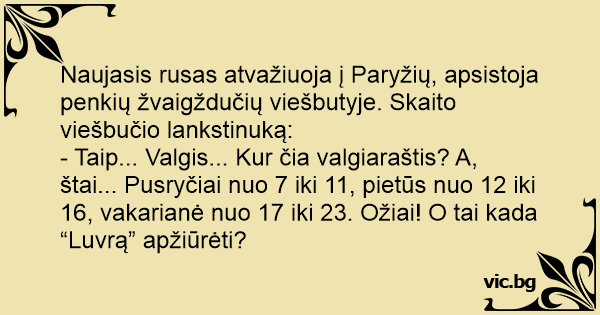 - Taip... Valgis... Kur čia valgiaraštis? A, štai... Pusryčiai nuo 7 iki 11, pietūs nuo 12 iki 16, vakarianė nuo 17 iki 23. Ožiai! O tai kada “Luvrą” apžiūrėti?