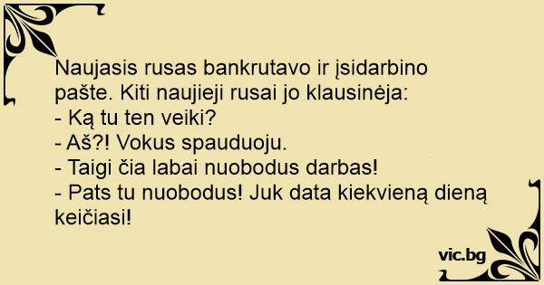 Naujasis rusas bankrutavo ir įsidarbino pašte. Kiti naujieji rusai jo klausinėja: