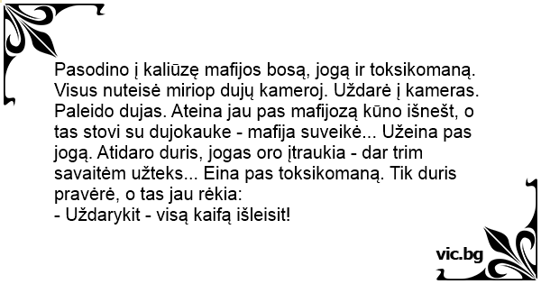 Pasodino į kaliūzę mafijos bosą, jogą ir toksikomaną. Visus nuteisė miriop dujų kameroj. Uždarė į kameras. Paleido dujas. Ateina jau pas mafijozą kūno išnešt, o tas stovi su dujokauke - mafija suveikė... Užeina pas jogą. Atidaro duris, jogas oro įtraukia - dar trim savaitėm užteks... Eina pas toksikomaną. Tik duris pravėrė, o tas jau rėkia: