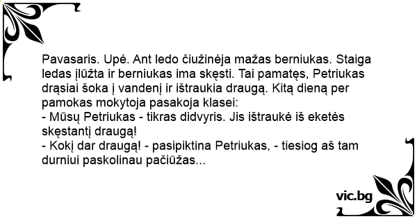 - Kokį dar draugą! - pasipiktina Petriukas, - tiesiog aš tam durniui paskolinau pačiūžas...