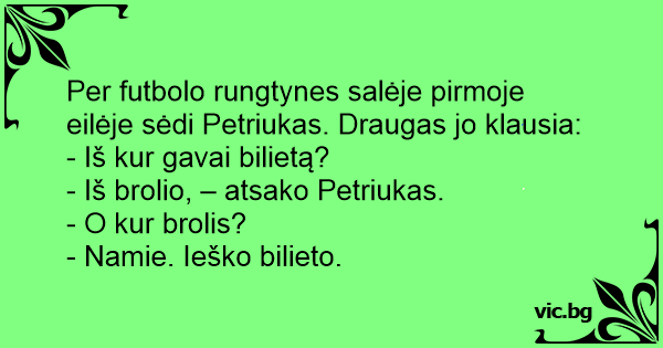 Per futbolo rungtynes salėje pirmoje eilėje sėdi Petriukas. Draugas jo klausia: