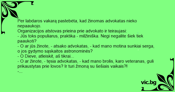 - O ar žinote, - tęsia advokatas, - kad mano brolis, karo veteranas, guli prikaustytas prie lovos? Ir turi žmoną su šešiais vaikais?!