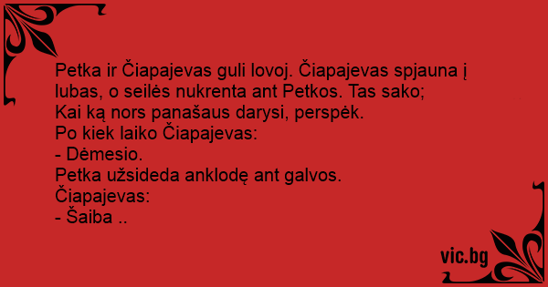 Petka ir Čiapajevas guli lovoj. Čiapajevas spjauna į lubas, o seilės nukrenta ant Petkos. Tas sako;