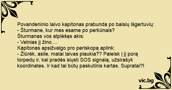 - Žiūrėk, asile, matai laivas plaukia?? Paleisk į jį porą torpedų ir, kai pradės siųsti SOS signalą, užsirašyk koordinates. Ir kad tai būtų paskutinis kartas. Supratai?!